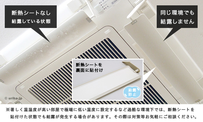 冷房時ウェーブルーバーには直接エアコンの冷風が当たるため、ウェーブルーバー本体が冷えて結露を生じます。当店では結露対策用の断熱シートを特別付属、機械類・頭上のエアコンにも安心です。